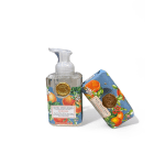 Stylized design of tropical blooms and garden flowers. Bright colors of orange, yellow and lime green. Tall and upright.